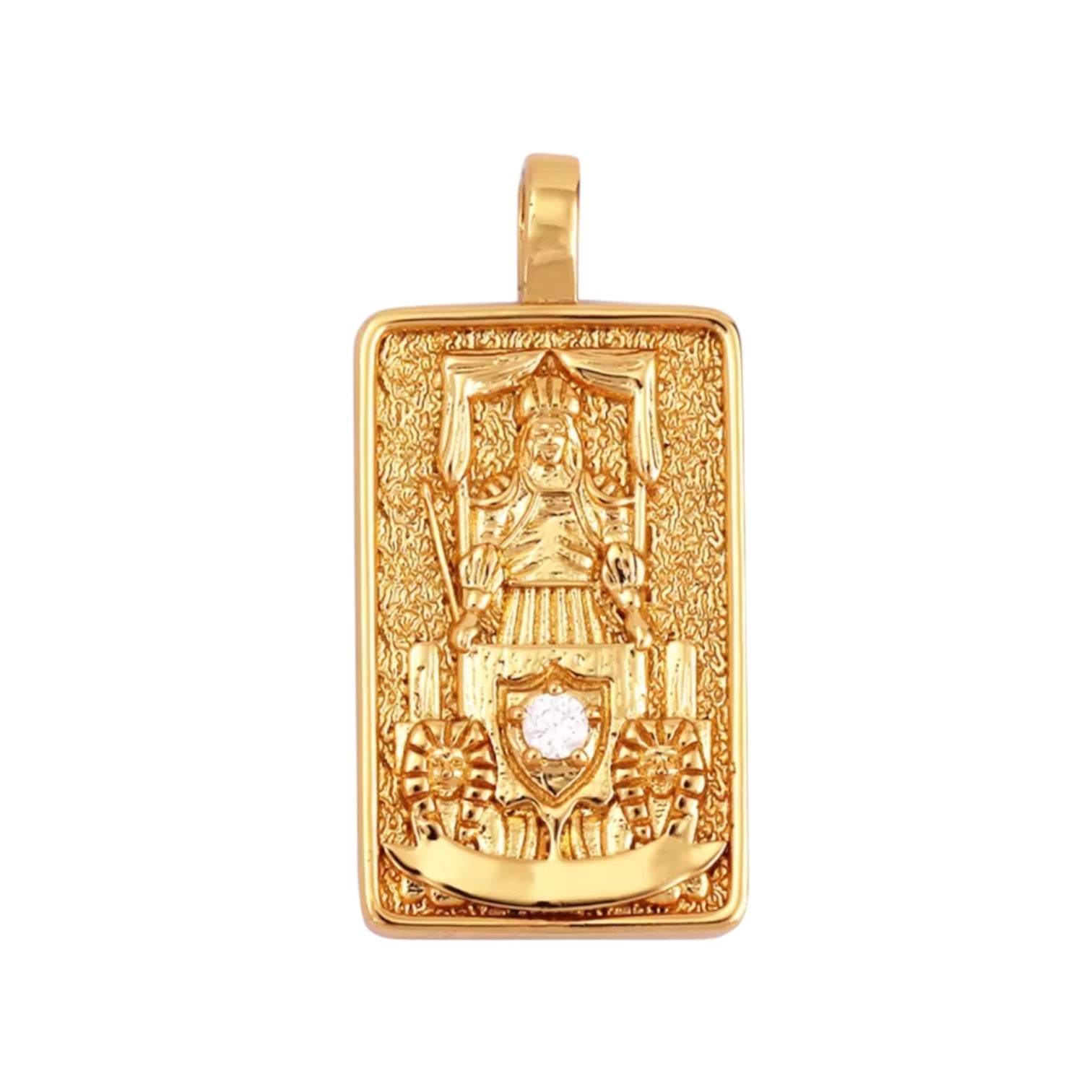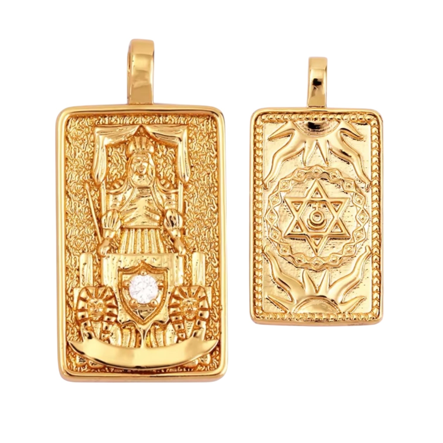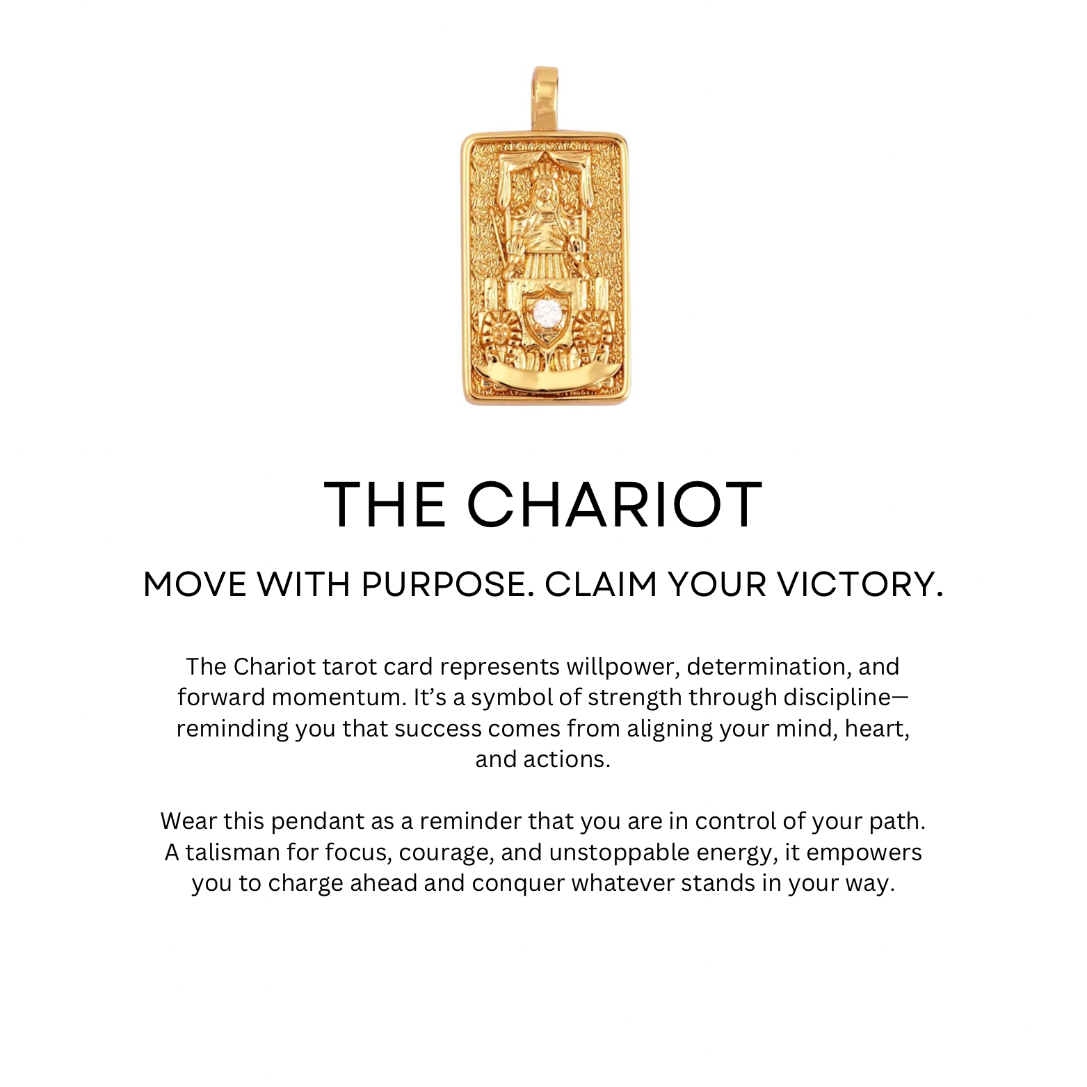 Crafted with precision and plated in brilliant 14K gold, The Chariot pendant features a radiant zircon crystal to mirror your unstoppable light. Whether you’re chasing a vision, moving through challenges, or stepping boldly into your purpose, this necklace reminds you to stay the course and trust your drive.