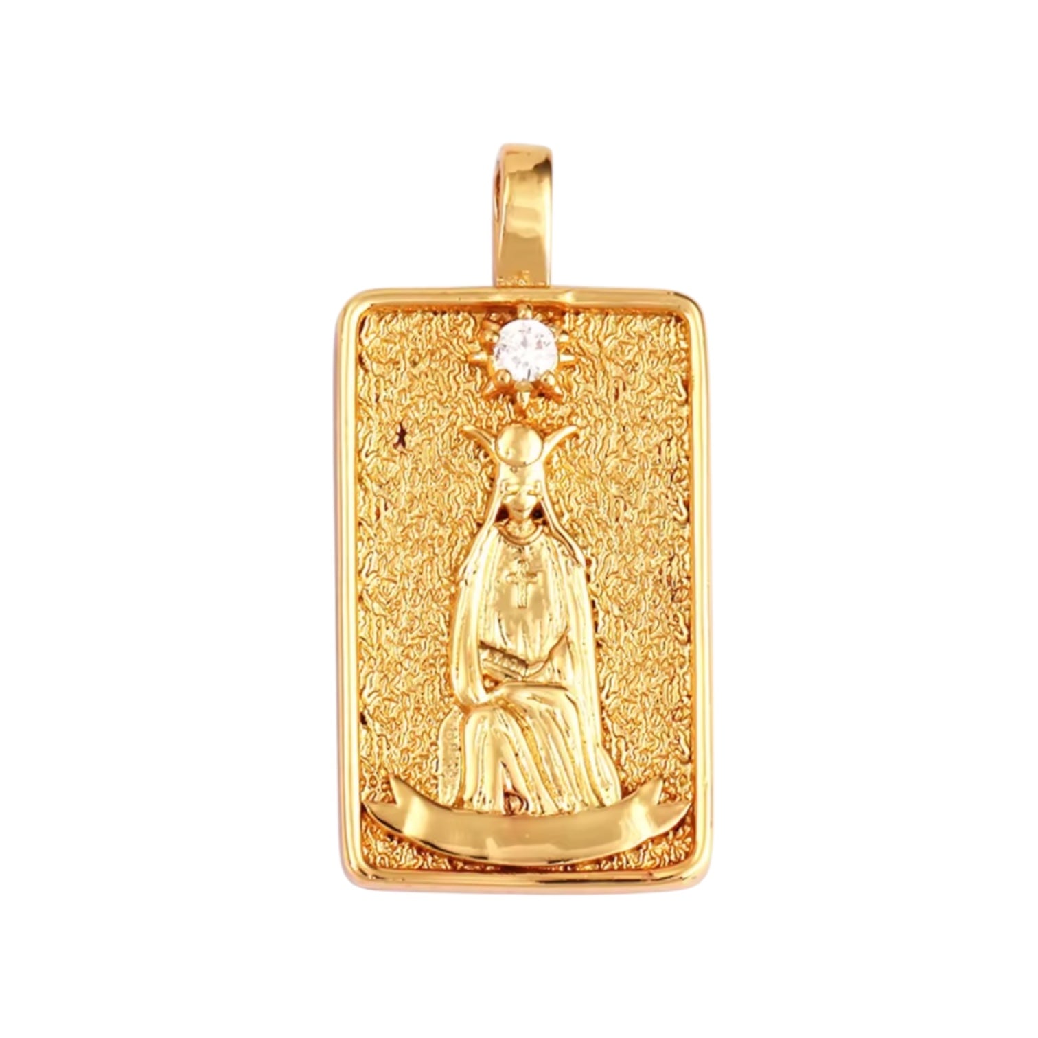Handcrafted with intricate detail and plated in radiant 14K gold, The High Priestess pendant holds space for the unseen—its sparkling zircon reflecting your inner light. Whether you’re tuning into your truth, deepening your spiritual practice, or simply embracing your feminine power, this necklace is your reminder to listen, feel, and trust your own inner oracle.